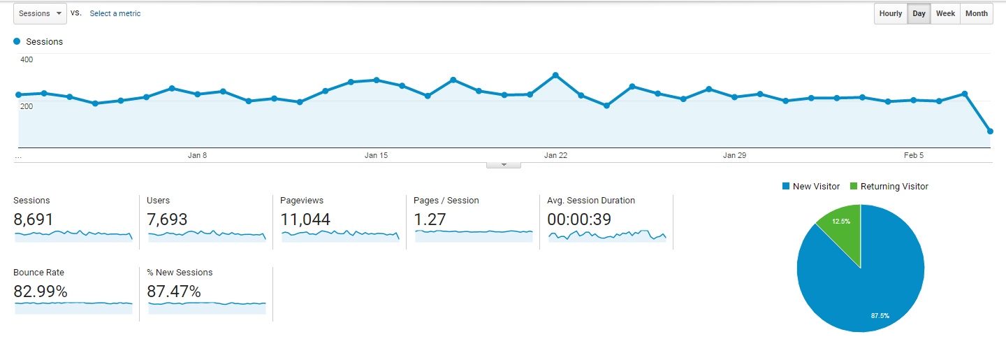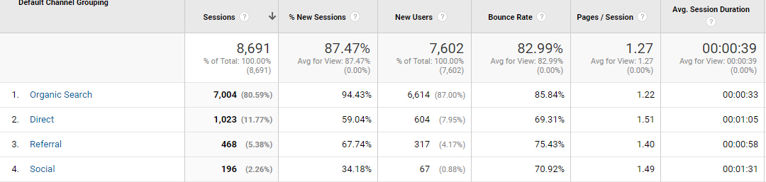 You’ll note that I’m averaging over 200 people a day, but they aren’t staying. An 83% bounce rate is pretty bad. Under a minute stay certainly isn’t wonderful either. People land and leave.