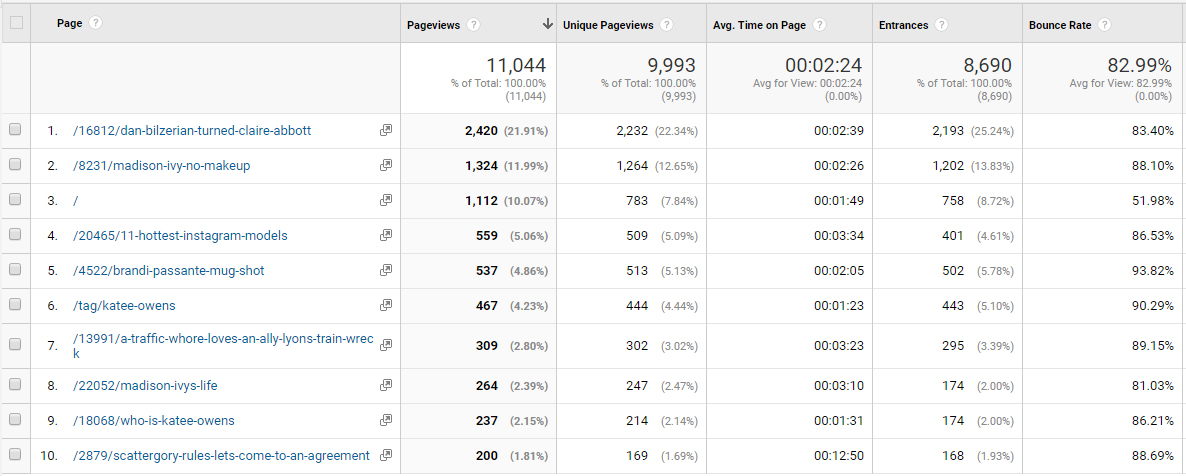 This should come as no surprise. Dan Bilzerian and Claire Abbott dominate the traffic. The 3rd place / is the home page, so I’m pretty pleased with a 51.98% bounce rate. Notice the only traffic the site gets is featuring hot women.