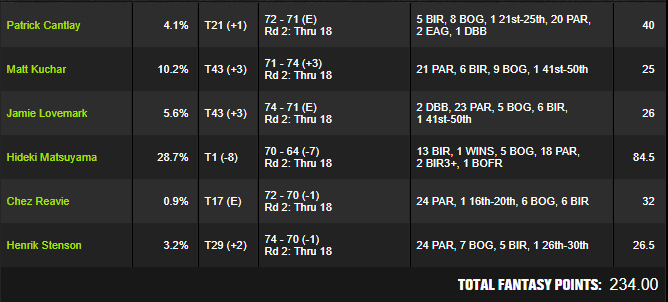 I have more action on the PGA as well. I put 10 dollars on Louis at 70-1 and 5 more at 40-1. He’s currently in 5th place at 14-1. I also have 4 on Henrik Stenson to win 600 which is unlikely. I did mange to pass all 6 people in 1 DK team which is always a good chance to cash. The lineup is Cantlay, Kuchar, Lovemark, Matsuyama, Reavie, and Stenson. Xander Schauffele and Daniel Berger prevent 2 other teams from passing 6 so I’m hoping for maybe a min cash on those ones if I get lucky.