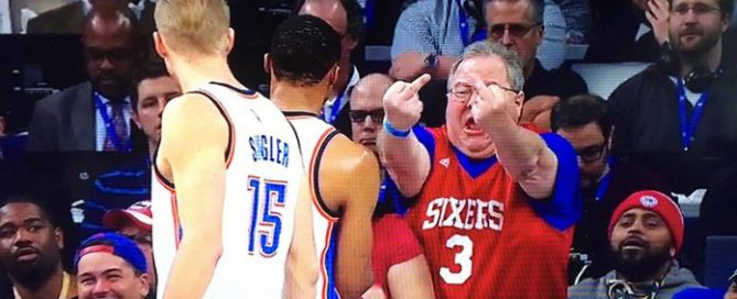 Sixers fan on baseline just gave Russell Westbrook the double birds after an and-1. Westbrook reaction: pic.twitter.com/KwTeswmFJv