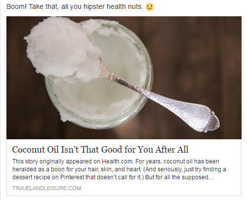 Before you start saying, “why should I trust this article over one that says it’s good?” I have to point out that I don’t care about coconut oil. My point is strictly that most people in our age have no idea what they’re talking about. This coconut oil article relates to doctor’s smoking cigarettes in the 50’s. People in that age didn’t know that smoking cigarettes lead to lung cancer. This could easily be the case that using coconut oil could lead to instant death.