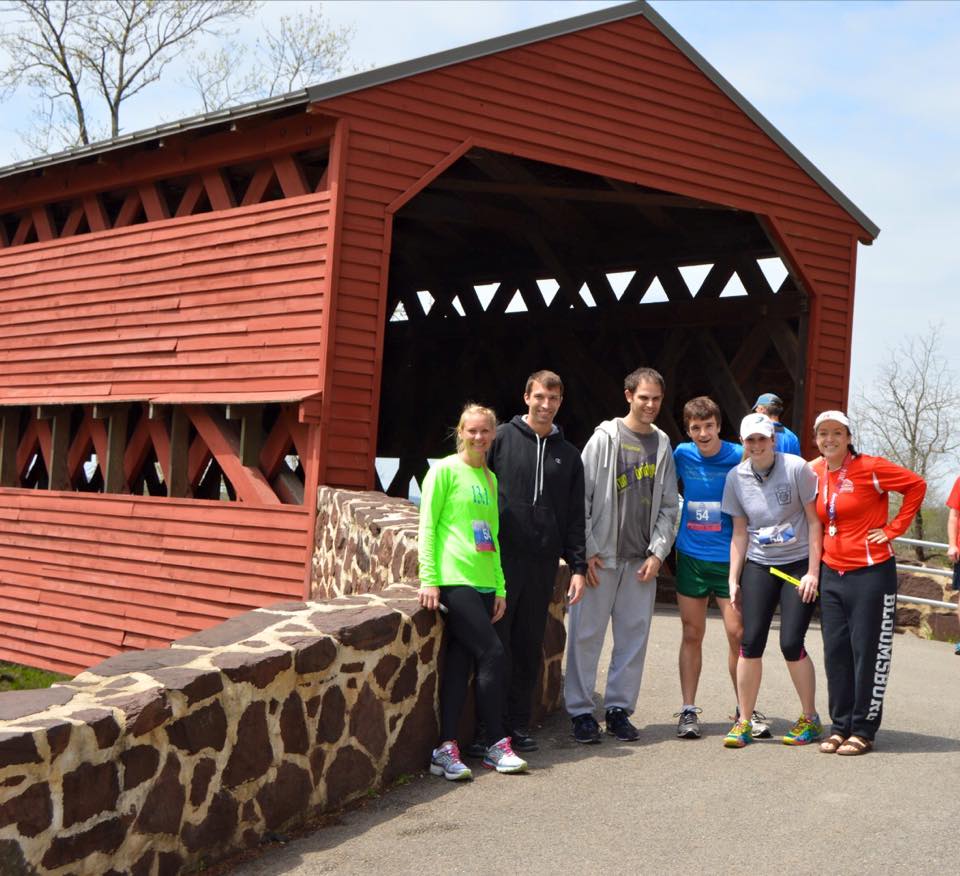 Jackie successfully (I’m not sure what word she’d use) completed her leg 3 while we watched Steven stand over a hole in the ground keeping runners from stepping in it. The picture to the right was taken which was the members in our van and a covered bridge. It’s also noted the Holly completed her leg (and the next 2) with a busted ankle so she didn’t pull a “Chad”. More on this later.